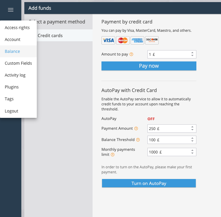 After you have made a successful purchase, you can also switch to Autopay allowing you to automatically add credit when the balance is low.